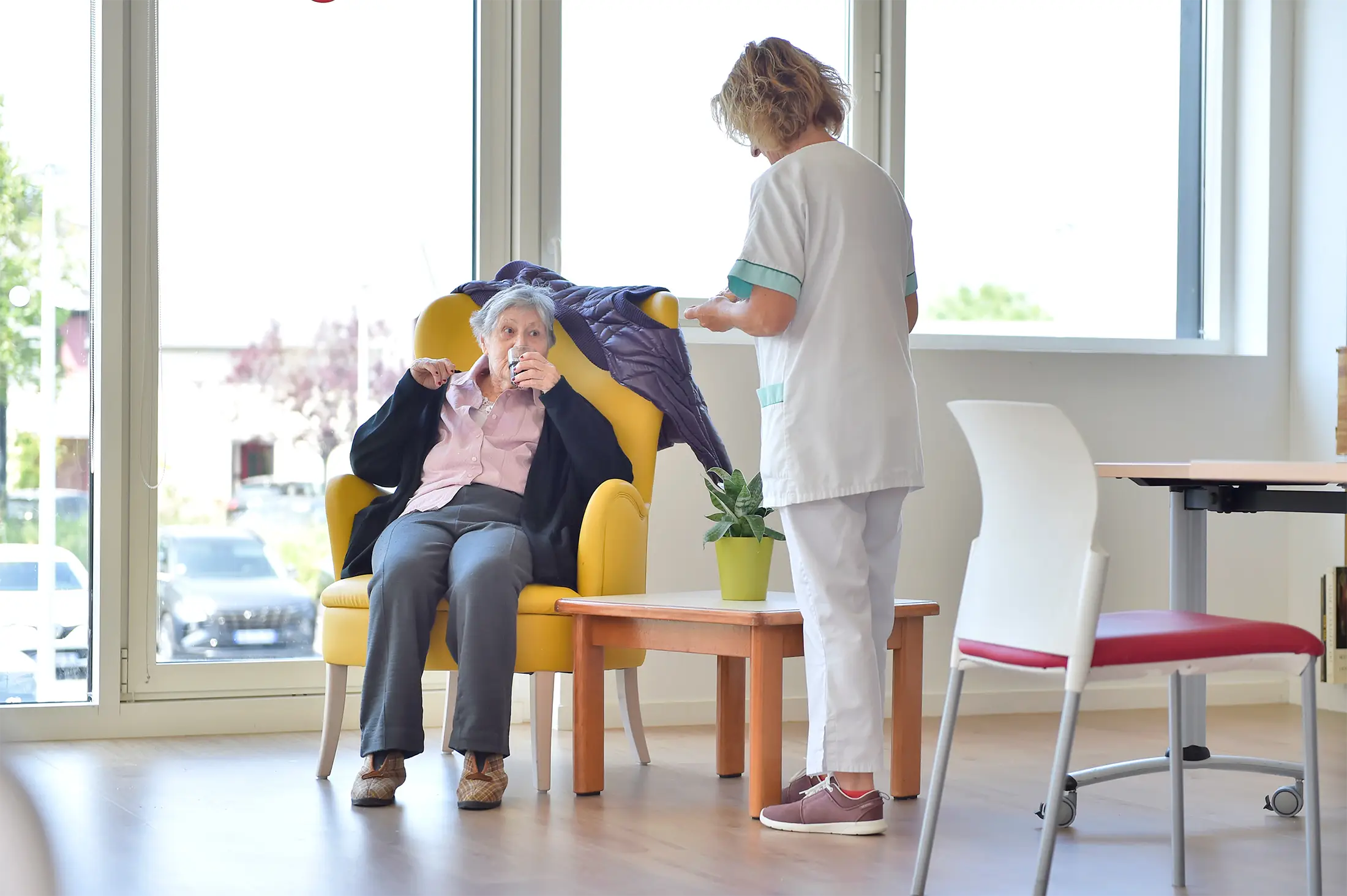 aidé.e de sa famille : pré-accueil, visite des locaux, présentation du fonctionnement de l’établissement et enregistrement des attentes du/de la résident.e et de sa famille.
